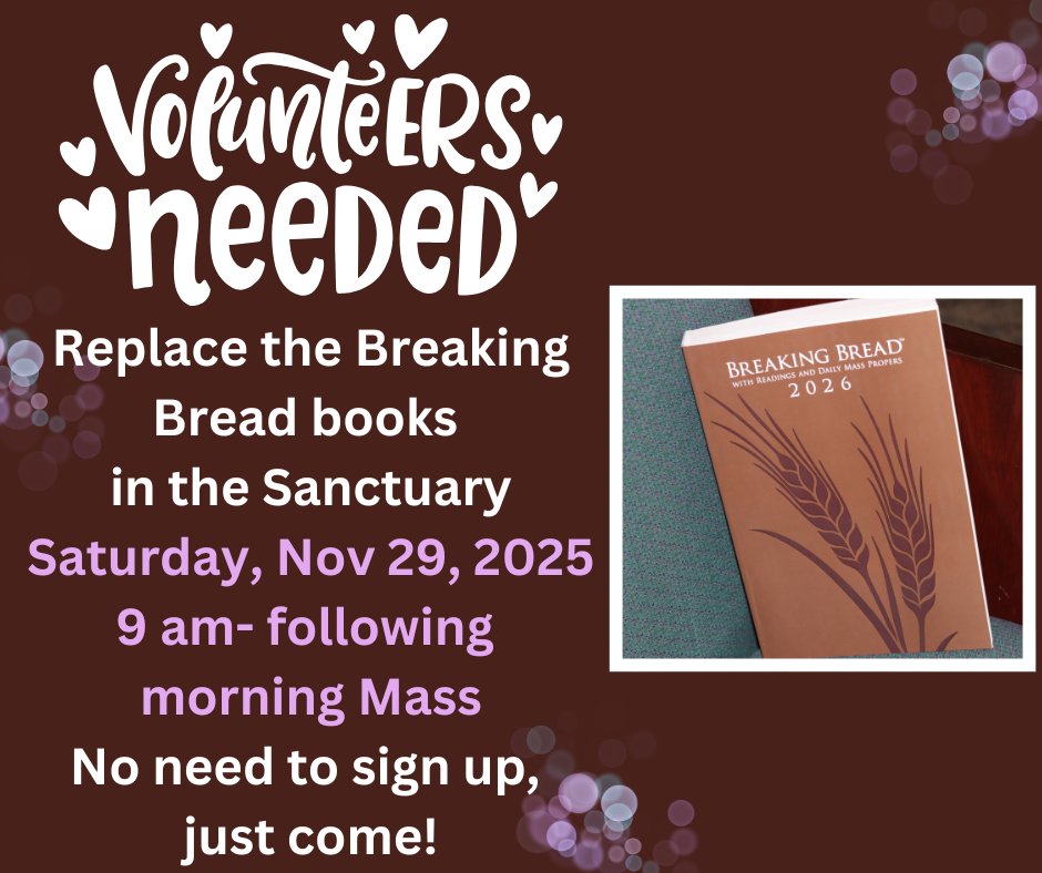 - St. Vincent de Paul donate your gently used or new coats by bringing them into the parish office; there is a marked box in the parish lobby: December through February.