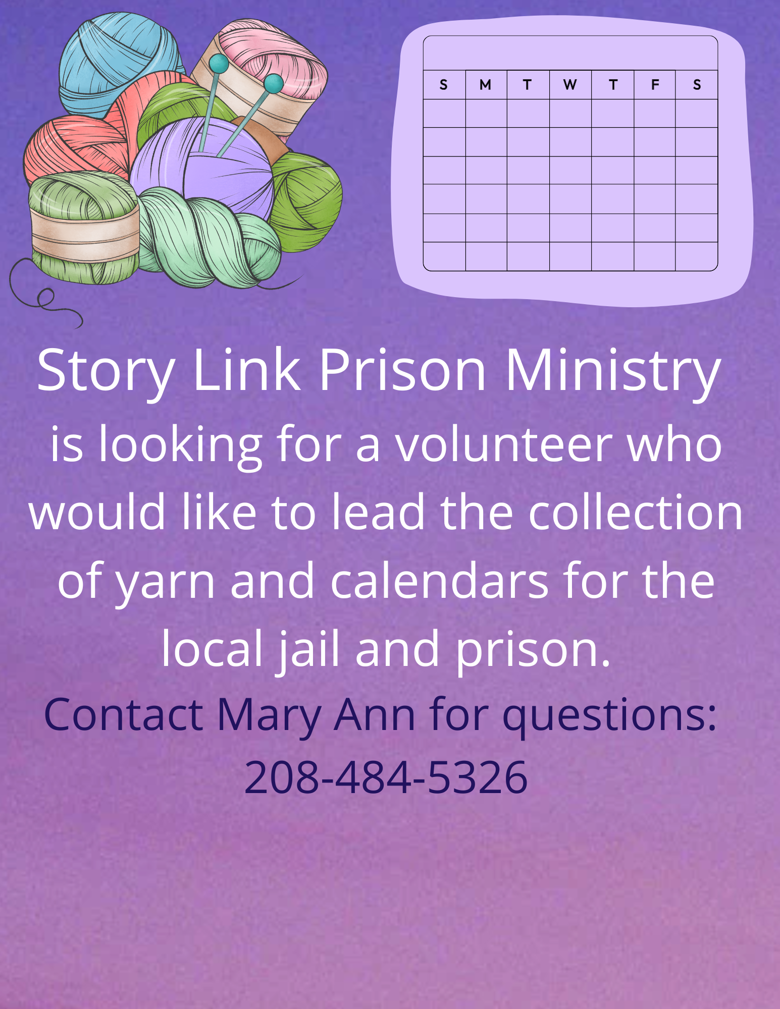 - Story Link Prison Ministry- donations of calendars are needed, and other opportunities are available as they arise. Contact: Mary Ann Kojis, markojis77@gmail.com 208-484-5326